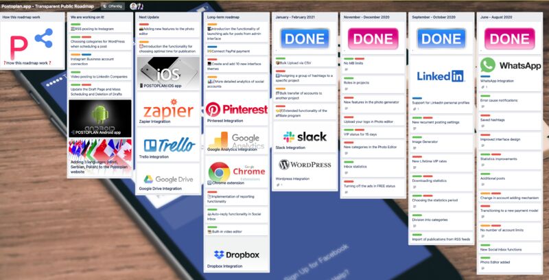Publik utveckling. Fler utvecklingsteam blir mer transparenta. Det gör att denna ”mörka sida” blir mer publik och kunden får en insikt i vad vi gör. Tex teamet för denna sociala media-app delar med sig av sin roadmap i en Trello Board. Snyggt. Smart. Hur ser ditt utvecklingsteams board ut? https://lnkd.in/dXhk3hn #systemutveckling #systemutvecklare