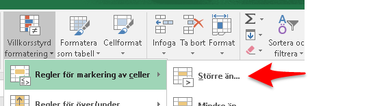Om du vill ta bort markeringarna så välj Villkorsstyrd formatering och Radera regler.