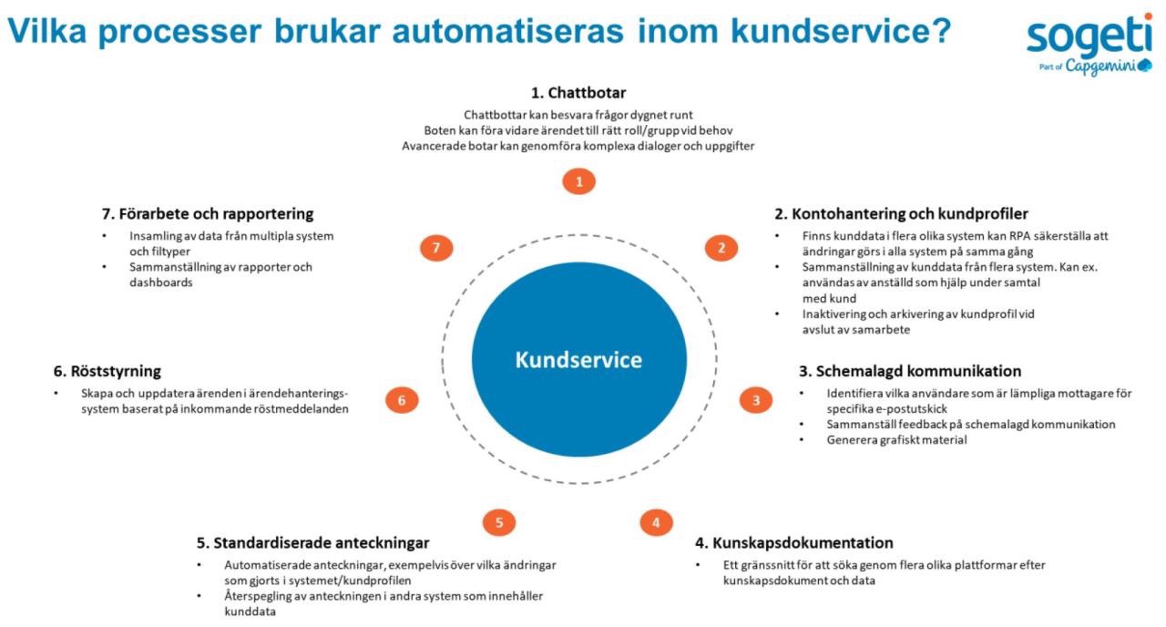 Effektivare kundservice. Det blir mycket prat i veckan om hur teknik, automation och data kan skapa en ny typ av kundservice. Joakim visar och jag guidar i ett webinar på torsdag ”AI för smartare möten offentlig sektor”. Generellt är automatiseringen en del av vår dagliga transformation. Lite värdeskapande processer som är kopplade till kundservice där automation kan vara aktuell: